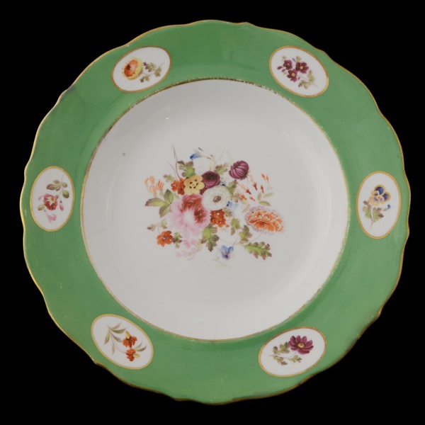 • SERVIÇO DUQUE DE CAXIAS - Raríssimo prato raso de porcelana francesa pertencente ao Serviço de Duque de Caxias. Rica decoração em reservas, com arranjos florais policromados e realces a ouro sobre fundo verde. Brasão de Armas do Império ao centro. No verso marcas da manufatura Ch. Pillivuyt. Paris. Séc. XIX. 26 cm. Peça similar reproduzida à pág. 209 no Livro Louça da Aristocracia do Brasil, por Jenny Dreyfus. Fios de cabelo.