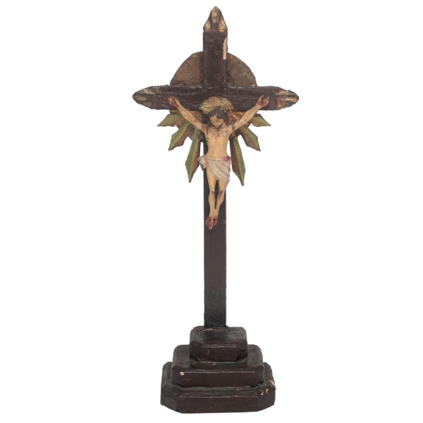 • Séc, XIX - Imagem em madeira policromada de Cristo Crucificado. Apresenta-se N. Senhor Jesus, de cabeça caída, vestindo o tradicional cendal. Cruz escura e lisa, com hastes rematadas em ponteiras, centralizando disco solar com folhagens na parte inferior. Base retangular em degraus. Defeitos na cruz). Séc. XIX. 41 x 16 cm (cruz). 14 x 10 cm (Cristo).