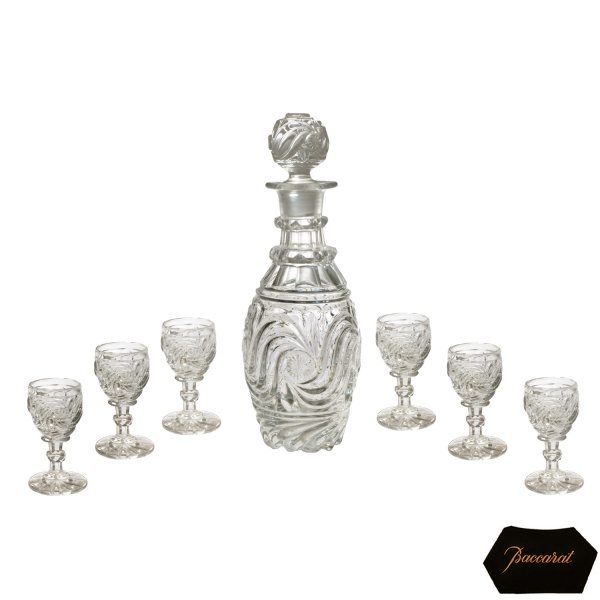 • BACCARAT - Elegante e original conjunto de licoreiro e 6 cálices em cristal francês lapidado. Bojo abaulado, com base moldada e ornada em gomos torcidos, encimada por larga faixa com ondas espiraladas centralizando medalhões. Gargalo facetado em corneta, interrompido por anelados e rematado por borda revirada. Tampa esférica no estilo. Copos cônicos repetindo as ondulações, apoiados em hastes aneladas sobre pés circulares. 23 cm (licoreiro). 9 cm (cálices).