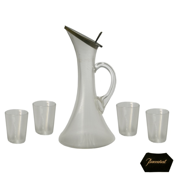 • BACCARAT  Singular e belo conjunto de jarra e 4 copos para suco, em cristal francês finamente moldado e ornamentado por discretos filetes horizontais. Bojo de formato afunilado com gargalo em corneta. Alça lateral em asa. Borda inclinada e reta, rematada por tampa plana e vazada com mexedor ao centro. Copos retos, levemente cônicos, repetindo o listrado. 17 cm (Licoreiro). 15 cm copos)