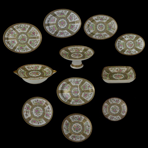 • Belíssimo serviço de jantar em porcelana chinesa, Cia das Índias  policromada, ornado no padrão Mandarim. Apresenta reservas e medalhões centrais floridos sobre fundos dourados, e realçados por elementos florais. Constando de 26 peças, sendo: 1 Travessa (42 x 34 cm), 1 travessa para assado (37 x 28 cm), 1 travessa (36 x 28 cm), 1 travessa (34 x 25 cm), 1 travessa (30 x 22 cm), 1 réchaud (7 x 25 x 30 cm), 1 fruteira (11 x 23 cm), 1 saladeira (24 x 24 cm), 6 prato raso (24 cm), 6 prato fundo (24 cm) e 6prato de sobremesa (20 cm).