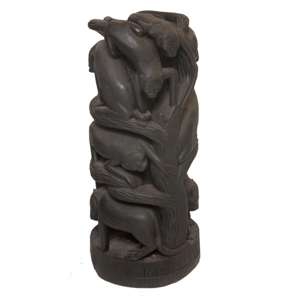 • ANTONIO JULIÃO  Escultura em madeira escura representando coluna com leão ao pé de árvore com macacos. Assinada. Antônio tornou-se o mais famoso da família Julião, a qual reúne desde a década de 1960 um grupo de escultores em madeira na cidade de Prados, perto de Tiradentes, Minas Gerais.. 85 x 30 cm.