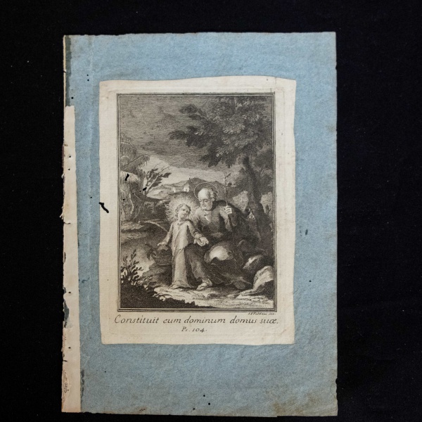 • Antiga gravura representando Jesus Menino com São Joaquim, seu avô. Acompanha abaixo a legenda Constituit cum dominum domus suae (Constituiu-o senhor de sua casa). Pequenos danos causados por traças.