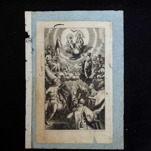 • Antiga gravura representando Cena Bíblica com apóstolos, santos, santas e anjos, encimada por Deus pai, Deus Filho e o Espírito Santo. Pequenos danos causados por traças. Séc. XVIII.