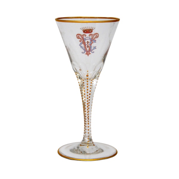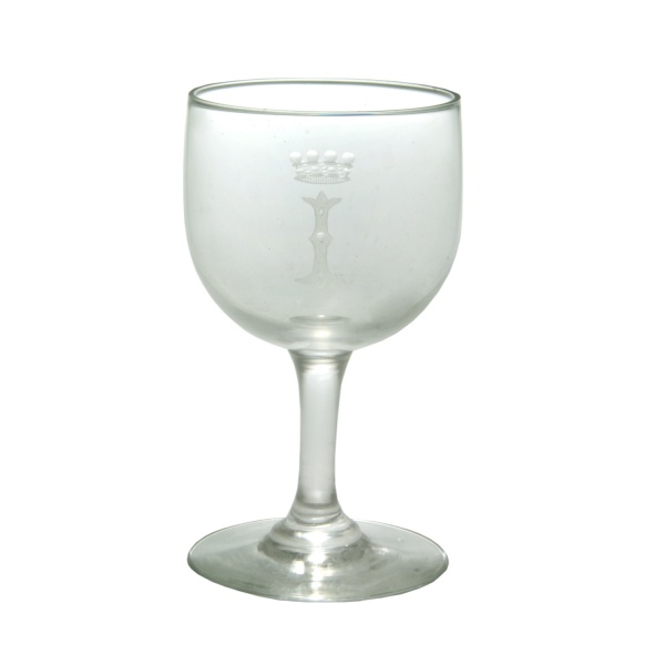 • IMPERIO BRASILEIRO. BARÃO DO IBIROCAI - Cálice em cristal translucido pertencente ao Primeiro e único Serviço do Barão de Ibirocaí (Luís de Freitas Vale). Bojo liso apresentando a inicial encimado por coroa. 9 cm.