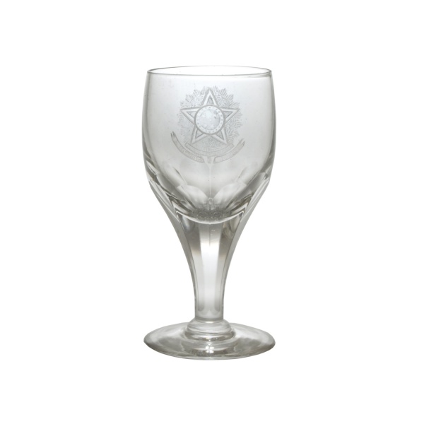• ESTADOS UNIDOS DO BRASIL 15 de Novembro de 1889 - Copo em cristal lapidado, com bojo cônico realçado por facetas dedão. Apresenta à frente gravação com o brasão de armas dos Estados Unidos do Brazil, tendo estrela de 5 pontas e data de 15 de Novembro de 1889. Haste facetada apoiada em base circular. 10 cm.