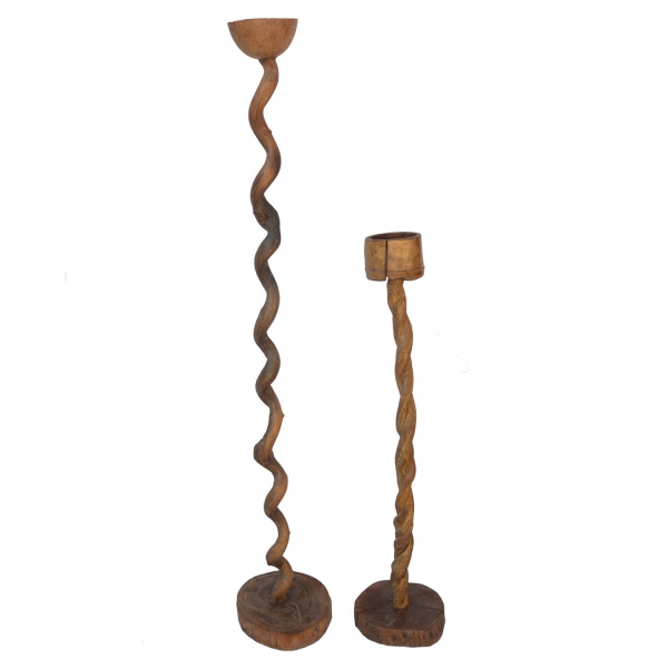 • Lote constando de 2 castiçais em madeira entalhados .em retorcidos. 136 cm e 93 cm. Sinais de uso e do tempo.