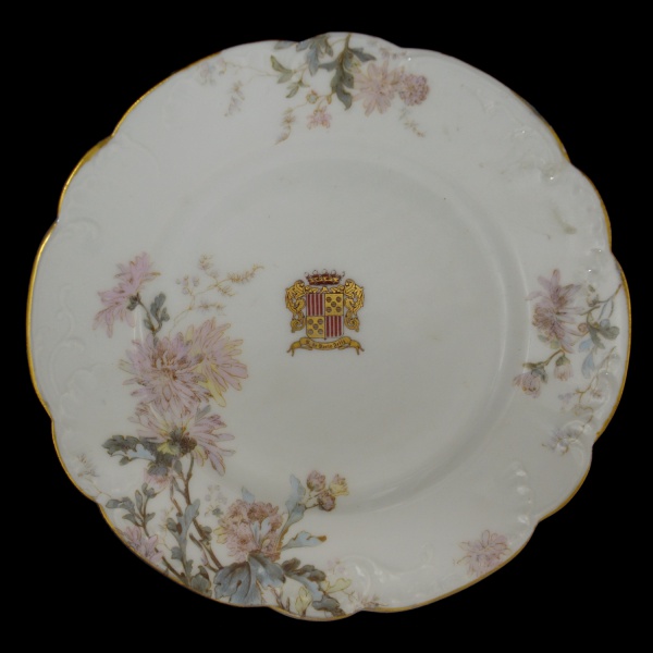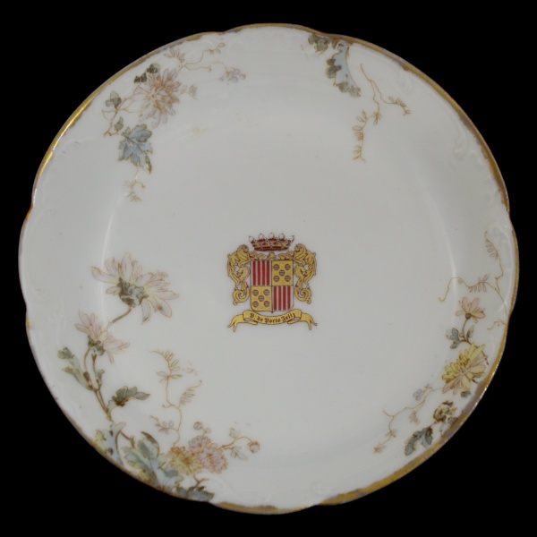 • BARÃO DE PORTO FELIZ  Prato raso em porcelana europeia policromada, pertencente ao Serviço do primeiro e único Barão de Porto Feliz (Cândido José de Campos Ferraz - Campinas, 1830 - Rio Claro, 1880). Apresenta borda recortada e filetada em dourado. decorada em alto relevo com ramos de flores, e ao centro o brasão com armas. França. Século XIX. Marca da manufatura Limoges Haviland ao fundo. 20 cm. Fazendeiro e político brasileiro, líder do Partido Conservador na região de Limeira, São Paulo, e fundador da colônia agrícola de Boa Vista.