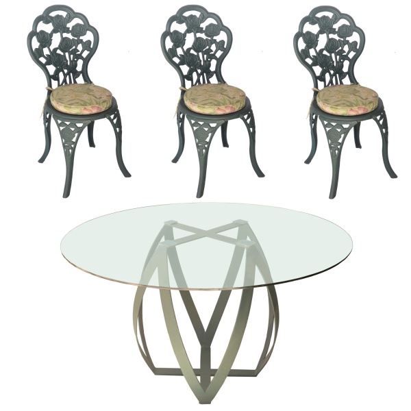 • Conjunto para área externa, composto por mesa com tampo de vidro circular, apoiado em pés de ferro e 3 cadeiras de ferro pintadas de verde. 77 x 38 x 35 cm. Esta disponivel para ser visto. Este lote encontra-se na Granja Julieta, SP. Retirada com agendamento antecipado em nosso Escritório do Leilão  11.5044.1228.