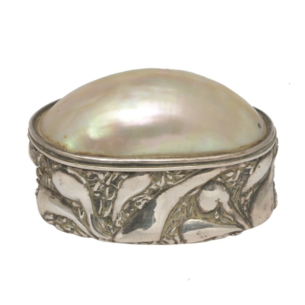 • Caixa ovalada em metal prateado, repuxado e cinzelado, ornado por adornos fitomórficos. Bordas caneladas e tampa em madrepérola no formato de cúpula. Marca do fabricante com numeração sob a base. 6 x 8 x 5 cm.