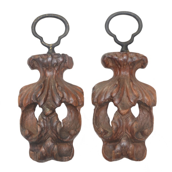 • Par de originais arremates decorativos em madeira esculpida, vazada e ornada por frisos florais e adornos estilizados. Topos com argolas ovaladas em metal. 26 x 12 cm.