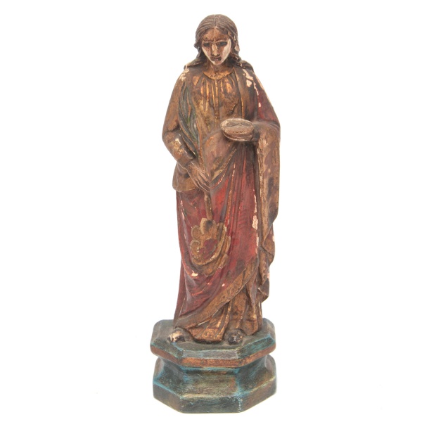 • ARTE SACRA. Séc. XIX - Imagem de Santa Luzia em madeira policromada. Apresenta-se a segurando na mão esquerda pequeno prato com os olhos e palma, símbolo de seu martírio, na direita. Exibe longas e amplas vestes bordadas. Base retangular chanfrada. Apresenta defeitos e perdas na pintura. 25 x 8 x 6 cm.