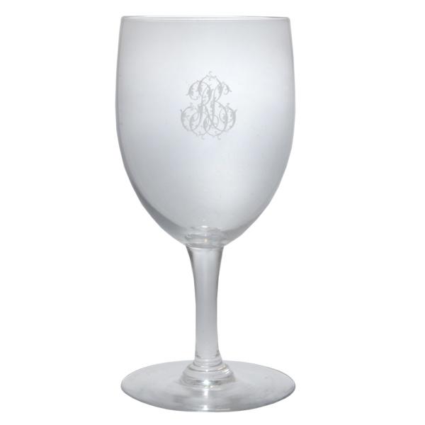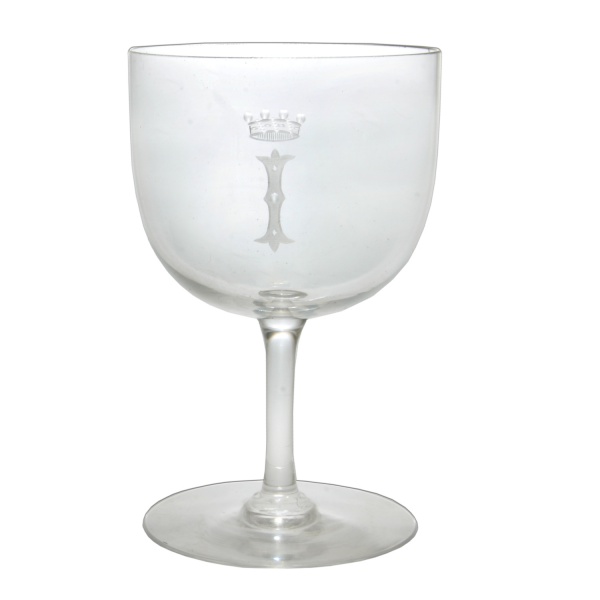 • IMPERIO BRASILEIRO. BARÃO DO IBIROCAI - Cálice em cristal translucido pertencente ao Primeiro e único Serviço do Barão de Ibirocaí (Luís de Freitas Vale). Bojo liso apresentando a inicial encimado por coroa. 13 cm.
