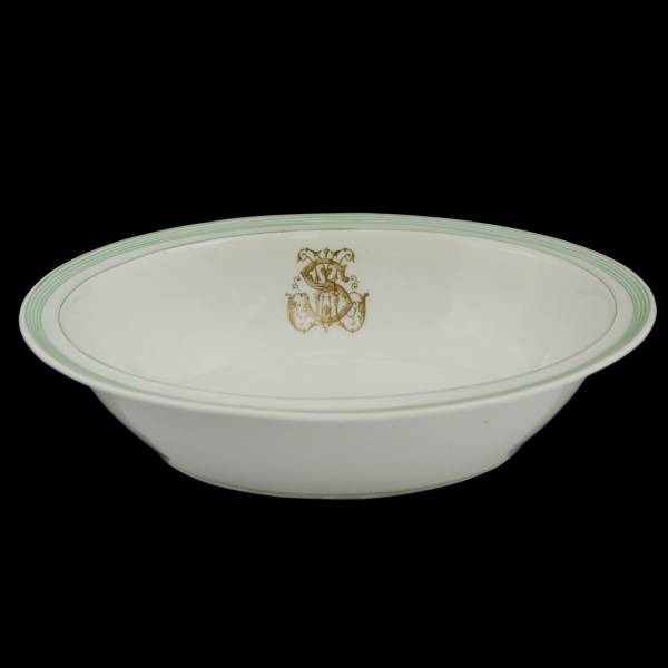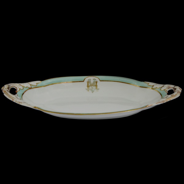 • LIMOGES  Travessa oblonga em porcelana francesa branca. Apresenta borda verde água com filetes dourados, interrompida por monograma. Extremidades rematadas por alças vazadas e recamadas com folhagens. No verso, marcas da manufatura e da casa comercial W. Guérin & Cie  Paris & Limoges. 30 x 13 cm.