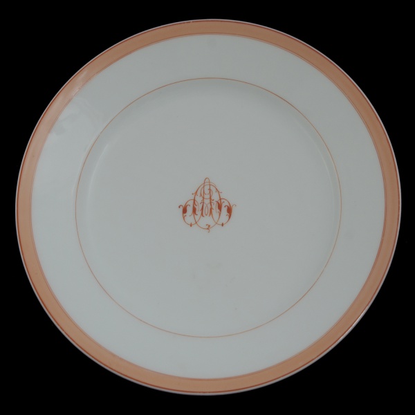 • Prato em porcelana francesa. Fundo de superficie branca com friso na cor rosa na borda. Iniciais entrelaçadas. 21 cm. No verso chancela da CH. Pillivuy & Co, Paris, Medaille Dor.