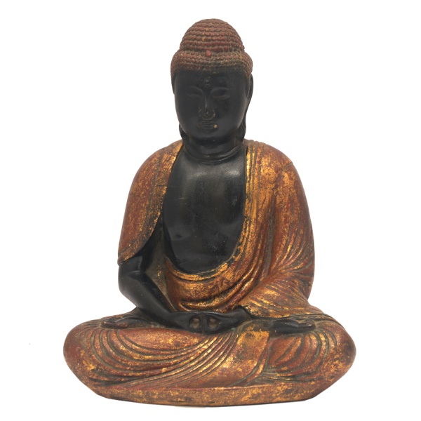 • Escultura em madeira laqueada a ouro sobre fundo preto. Apresenta Budha sentado com as pernas cruzadas, as mãos acopladas e meio fechadas, indicando postura de meditação. Séc. XIX. 33 x 26 x 18 cm.