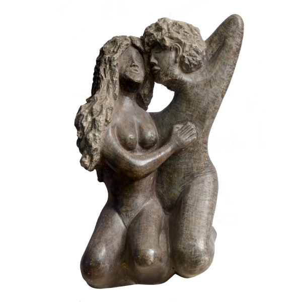 • Escultura em pedra, representando casal de namorados ajoelhados. 43 x 25 x 20 cm.
