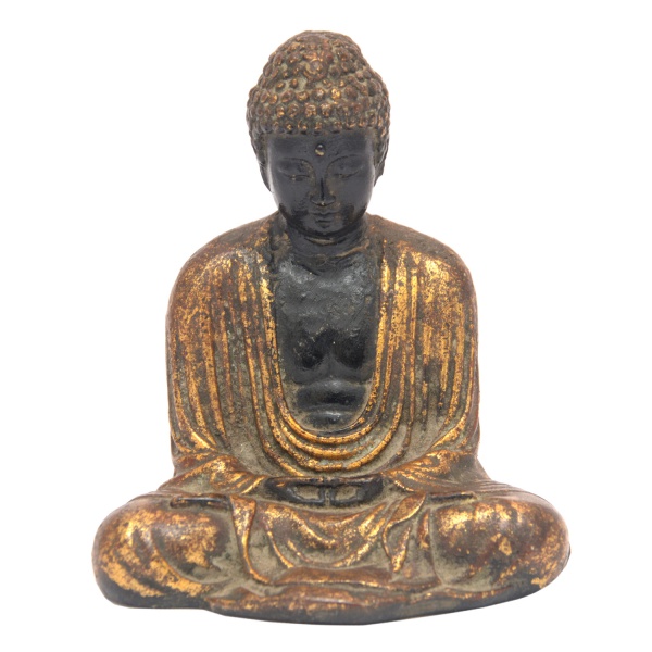 • Escultura em madeira laqueada a ouro sobre fundo preto. Apresenta Budha sentado com as pernas cruzadas, as mãos acopladas e meio fechadas, indicando postura de meditação. Séc. XIX . 15 x 13 x 10 cm. Sinais do tempo e do uso.