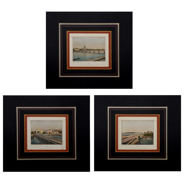 • Coleção com 3 pequenas litografias originais de Recife a partir de fotografia de A. Ducasble:1. Le Pont Izabel, L'Assemblée Législative Provinciale et Lle Gymnase.2. Grand Pont de Recife, ou Pont Sete de Setembro.3. La Présidence, le Théatre Izabel et L'Assemblée Législative.Rougeron & Vignerot litógrafos. Paris, final do Séc XIX. Raro. Sem moldura, mas com lindo passe-partout. 16 x 14 cm (MI). 33 x 37 cm (ME).