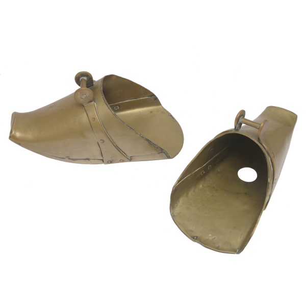 • Par de sapatas em metal dourado. 12 x 24 x 12 cm.