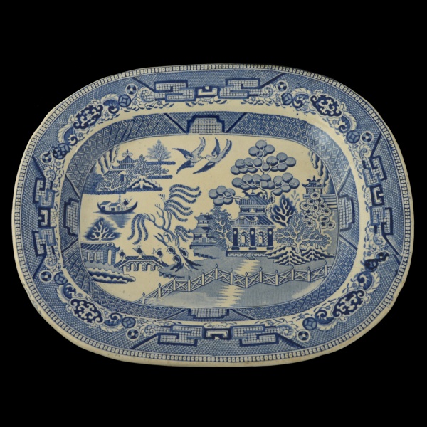 • Travessa em louça inglesa de formato oval e borda recortada. Apresenta decoração em azul sobre branca com riacho, ponte, castelo e personagens. Sem marca. 30 x 26 cm.