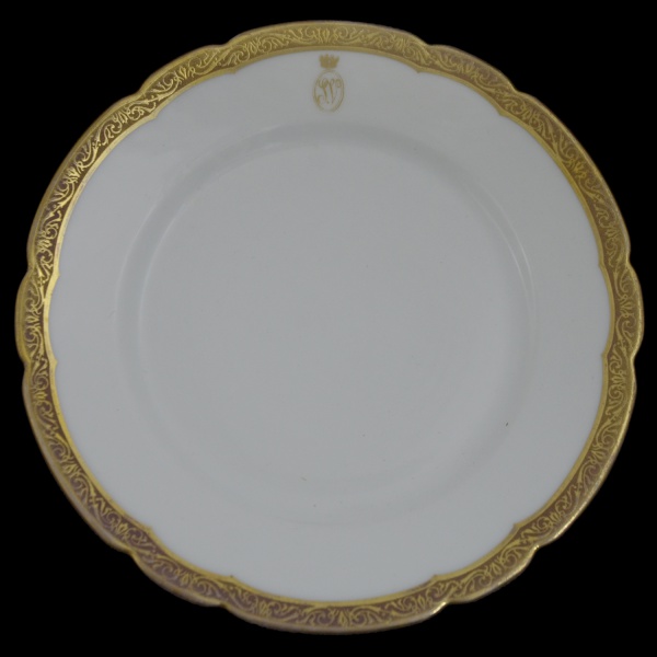 • IMPÉRIO BRASILEIRO. BARÃO DE VASCONCELOS  Prato circular e recortado em porcelana francesa de manufatura de Limoges. Pertencente ao Serviço Barão de Vasconcelos (José Smith de Vasconcellos). Corpo com filetados a ouro e reserva com as iniciais SV encimado por uma coroa de visconde. Marca de manufatura Limoges, France, W.G. & Cie. ao fundo. Século XIX. 19 cm. Peça do mesmo serviço reproduzida à pág. 343 no Livro Louça da Aristocracia do Brasil, por Jenny Dreyfus.