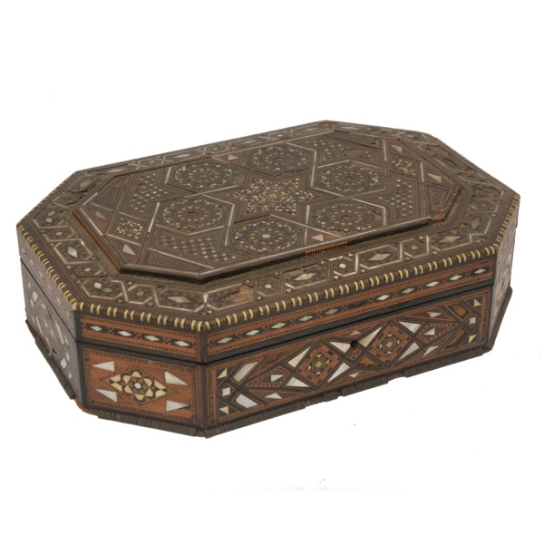 • Caixa em madeira, de formato retangular chanfrada. Apresenta profusa decoração incrustada com frisos, medalhões e rosáceas em madrepérola e outros materiais. Tampa centralizando estrela de 6 pontas à frente, e verso seguindo o estilo. Marrocos ou Oriente Médio. (mínimas perdas nos embutidos).