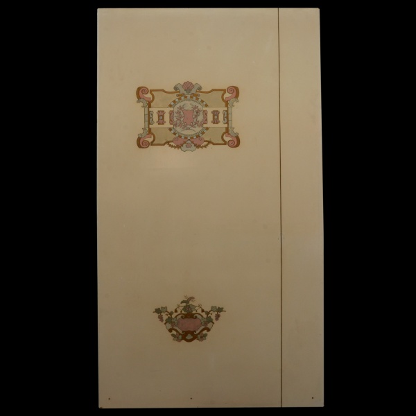 • DINUCCI, Salvatore  Adorno de porta ou parede. Desenho decorativo sobre pátina bege utilizando elementos naturais e representativos, em dourado antigo. São Paulo. Anos 1950. 203 x 104 cm.