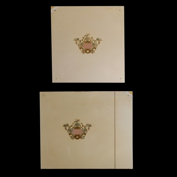 • DINUCCI, Salvatore  Conjunto de 2 adornos de porta ou parede. Desenho decorativo sobre pátina bege utilizando elementos naturais e representativos, em dourado antigo. São Paulo. Anos 1950. 104 x 90 cm  e 90 x 84 cm.