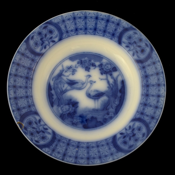 • JOHNSON BROTHERS  Prato raso em porcelana inglesa, decorado em azul. Apresenta larga margem com padrão geométrico realçado por reservas florais. Centro ornado por casal de aves em jardim florido. Marca da manufatura e do modelo Mongolia no verso. Fio de cabelo no verso. 23 cm.