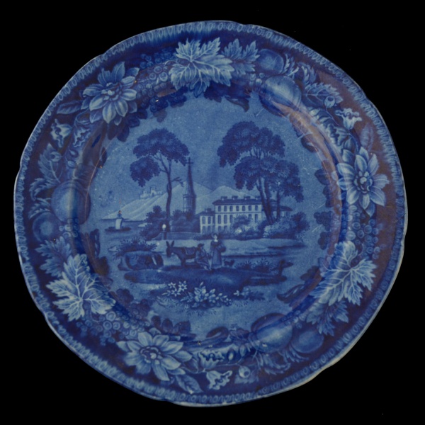 • Prato raso em porcelana inglesa, decorado em azul. Apresenta borda ondulada realçada por fino friso geométrico. Margem com flores, folhagens e frutas, centralizando paisagem campestre com montanhas, castelo, figuras e animais, 25 cm.