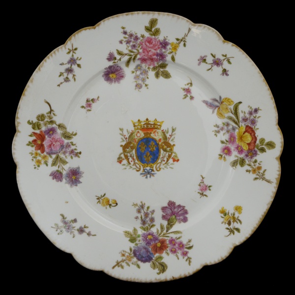 • MEISSEN - Prato em porcelana com borda ondulada e dourada, profusamente ornado em policromia com arranjos e adornos florais. Apresenta ao centro brasão de armas com flores de lis sob coroa, ladeado por composições florais. No verso, marca da manufatura. Séc. XIX. 26 cm.