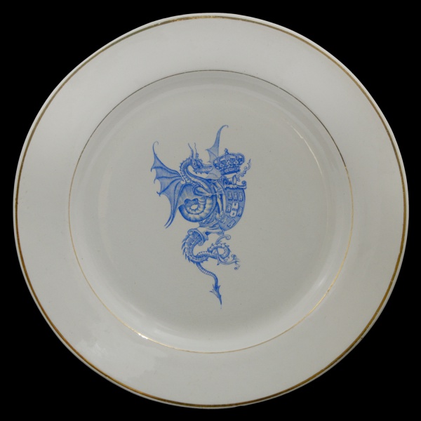 • FÁBRICA DE ALCANTARA  LISBOA - Prato em faiança portuguesa branca, com borda circular lisa. Centro ornamentado por sofisticada composição pictórica em esmalte azul. Apresenta belo dragão alado, segurando brasão de armas sob coroa, decorado com 7 torres e pequeno brasão com 5 escudos do rei D. Manuel ao centro. No verso, marca da manufatura. 23 cm.