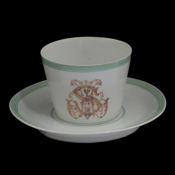 • IMPÉRIO BRASILEIRO. BARONESA LEOPOLDINA - Xícara para chá com seu pires em porcelana francesa da manufatura de Limoges, monogramado. Pertenceu ao Serviço da Baronesa Leopoldina da Fazenda São Martinho, com marca do importador: Casa Cypriano Rio de Janeiro. Século XIX / XX. 6 x 8 cm (xícara).14 cm (pires).