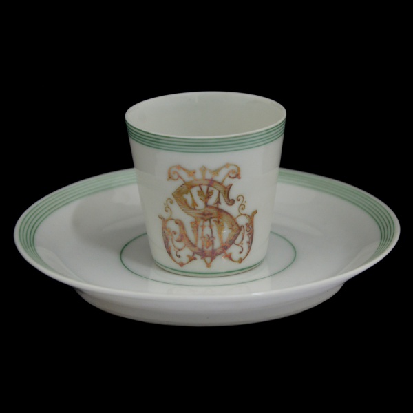 • IMPÉRIO BRASILEIRO. BARONESA LEOPOLDINA - Xícara para café com pires em porcelana francesa da manufatura de Limoges, monogramado. Pertenceu ao Serviço da Baronesa Leopoldina da Fazenda São Martinho, com marca do importador: Casa Cypriano Rio de Janeiro. Século XIX / XX. 5 x 6 cm (xícara). 14 cm (pires).