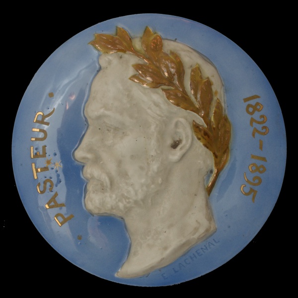 • EDMOND LACHENAL (1855-1930)  Medalhão em faiança esmaltada azul. Apresenta ao centro, em baixo-relevo de cor branca, cabeça perfilada do cientista Louis Pasteur, famoso fundador da microbiologia. Exibe, em dourado, coroa de louros na cabeça e borda com os dizeres Pasteur (1822 -1895). Assinado.23 cm.