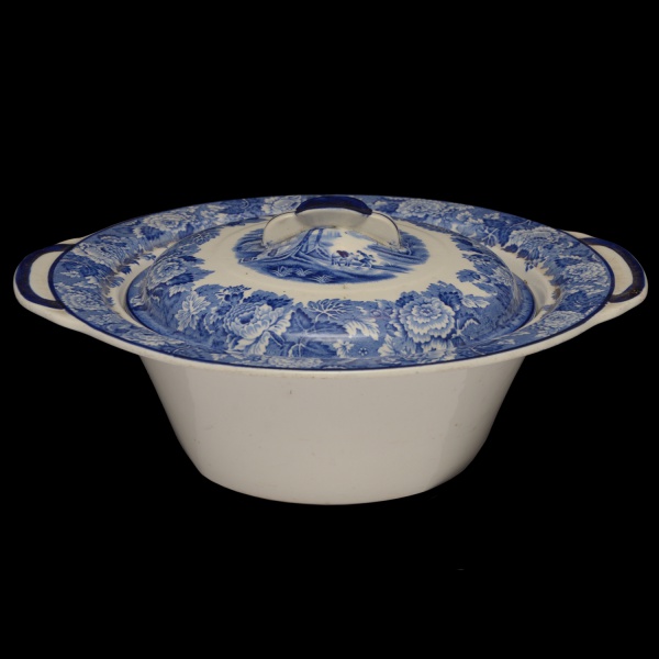 • ENOCH WOODS ENGLISH SCENERY E WOOD & SONS ENGLAND.- Legumeira circular em cerâmica inglesa nas cores azul e branco. Bojo e tampa decorados com paisagens e borda com flores. No verso marcas da manufatura.12 x 30 cm.