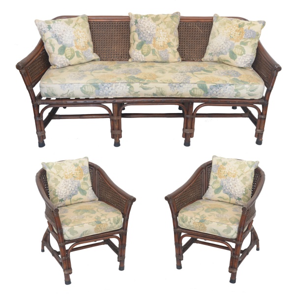 • Conjunto de sofá para 3 lugares e par de poltronas, com estruturas em bambu. Encostos arqueados em corbeille, acoplados a braços revirados. Pernas retilíneas, reforçadas por arcos e com as traseiras levemente inclinadas. Forração dos encostos em palhinha da Índia. Acompanham almofadas em tecido em floral com fundo marfim. No estado. 82 x 60 x 57 cm.