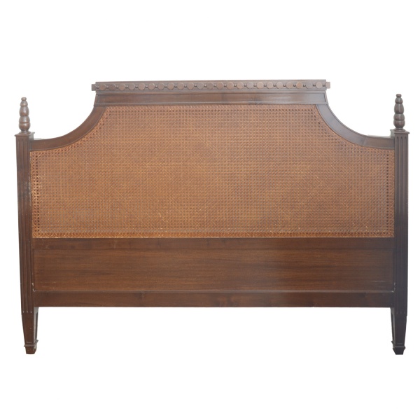 • Cabeceira de cama de casal em madeira nobre, de formato retangular. Parte superior forrada em palhinha da Índia, com quinas recortadas e ornadas por ponteiras, centralizando frontão reto e liso. Pernas curtas e retilíneas. 125 x 172 cm.