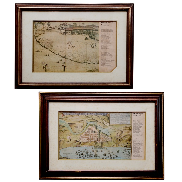 • Par de reproduções representando respectivamente Pernambuco e Itamaracá e Planta da Restituição da Bahia. Apresentam paisagens ladeadas na mesma ordem por textos informativos com os dizeres,  ...esse desenho se encontra no livro de Barleus Rerrarum per Octennium in Brasilia, impresso em latim em 1647, e o outro com ...o mapa foi feito em 1631 e faz parte do Atlas de Albernás que se encontra na Mapoteca do Itamarati no Rio de Janeiro. 26 x 42 cm (MI). 46 x 62 cm (ME) / 22 x 40 cm (MI). 42 x 60 cm (ME). Molduras em madeira. Marcas de oxidação.