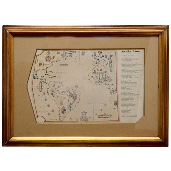 • Ilustração a cores representando América Austral. Apresenta detalhada paisagem, ladeada por texto informativo com os dizeres, ...carta elaborada em 1600 e assinada por Luiz Teixeira....o original em pergaminho iluminado encontra-se na Biblioteca Nacional de Florença. 27 x 43 cm (MI). 46 x 60 cm (ME). Moldura em madeira. No estado. Marcas de oxidação.