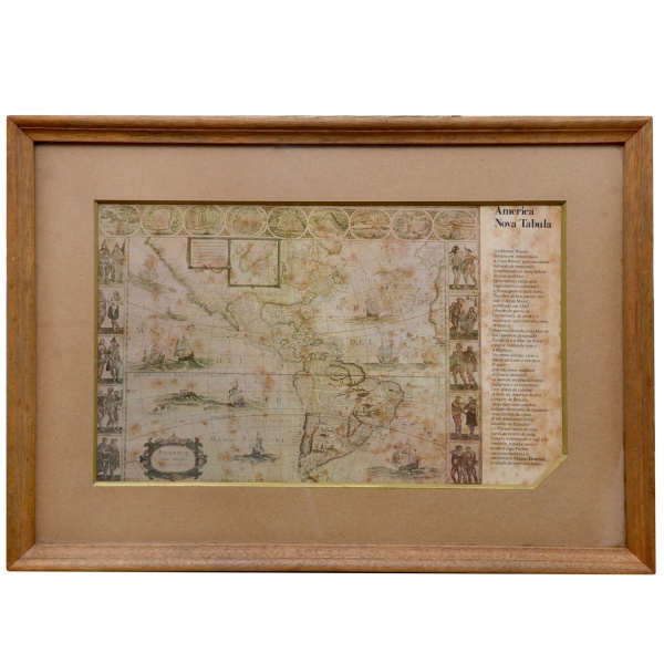• Ilustração a cores representando América Nova Tabula. Apresenta detalhada paisagem, ladeada por texto informativo com os dizeres, ...mapa tirado da obra-prima de Guilherme Blaeus, o Atlas Major, publicado em 1662 em Amsterdam. 25 x 42 cm (MI). 41 x 58 cm (ME).Moldura em madeira. No estado. No estado. Manchas de oxidação.