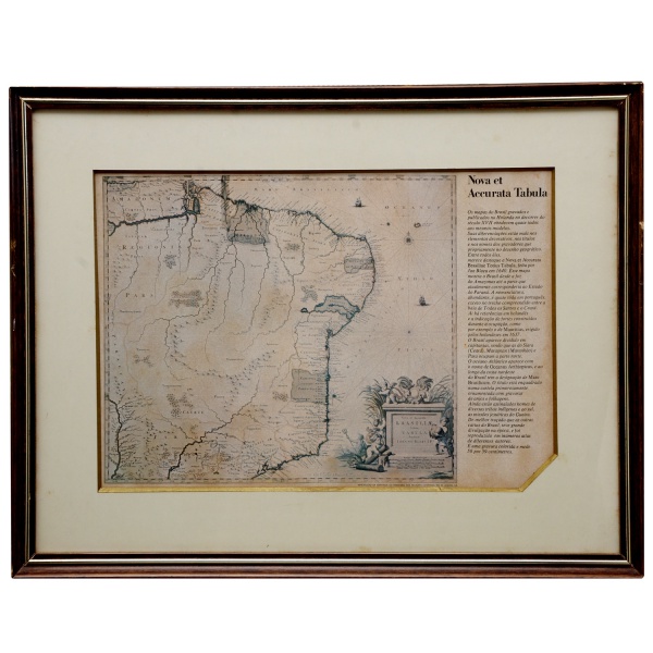• Ilustração a cores representando Nova et Accurata Tabula. Apresenta detalhada paisagem com as capitanias, ladeada por texto informativo com os dizeres, ...entre todos eles (mapas do Brasil gravados e publicados na Holanda no decorrer do século XVII) ....merece destaque A Nova e Accurata Brasiliae Totius Tabula feita por Joan Blau em 1640. 27 x 40 cm (MI). 41 x 54 cm (ME). Moldura em madeira. No estado. Manchas de oxidação.