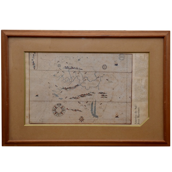 • Ilustração a cores representando América do Sul - Johan Martines. Apresenta mapa, ladeado por texto informativo com os dizeres, ...o mapa aqui reproduzido é a quarta carta de um atlas de 1582 encadernado em marroquim, e existente da Biblioteca do Arsenal em Paris. 42 x 25 cm (MI). 58 x 41 cm (ME). Moldura em madeira. No estado. Manchas de oxidação.