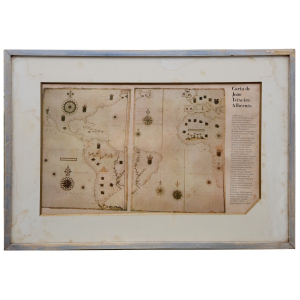 • Ilustração a cores representando Carta de João Teixeira Albernás. Apresenta 2 mapas, ladeados por texto informativo com os dizeres, ...a biblioteca do Port de Toulon possui um conjunto de 4 mapas não assinados, mas que Armando Cortesão e Avelino Teixeira da Mota, na obra Portugaliae Monumenta Cartographica, identificaram como sendo de autoria de João Teixeira Albernás, os dois primeiros aqui reproduzidos...entre os anos de 1632 e 1643, possivelmente em 1640. 25 x 42 cm (MI). 40 x 56 cm (ME). Moldura em madeira. No estado.  Manchas de oxidação.