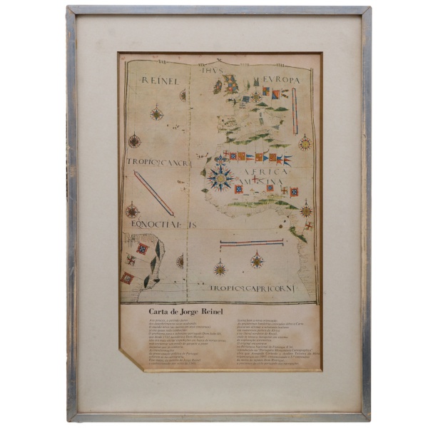 • Ilustração a cores representando Carta de Jorge Reinel. Apresenta mapa, ladeado por texto informativo com os dizeres, ...este mapa da autoria de Jorge Reinel e confeccionado por volta de 1540.... o original encontra-se na Biblioteca Nacional de Florença e reproduzido na Portugaliae Monumenta Cartographica, que Armando Cortesão e Avelino Teixeira da Mota, organizaram em 1960. 42 x 25 cm (MI). 56 x 40 cm (ME). Moldura em madeira. Manchas de oxidação.