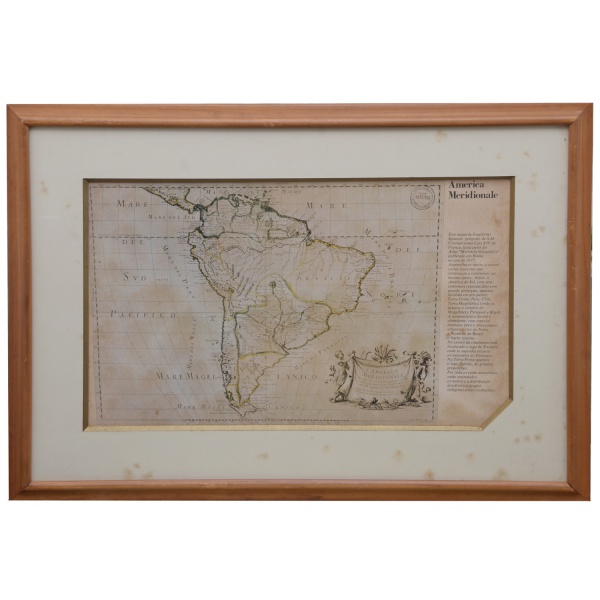 • Ilustração a cores representando America Meridionale. Apresenta mapa, ladeado por texto informativo com os dizeres, ...este mapa de Guglielmo Sansone, geógrafo de S.M.Louis XIV, rei da França, fazia parte do Atlas Mercúrio Geografico, publicado em Roma no ano de 1677. 25 x 42 cm (MI). 42 x 58 cm (ME). Moldura em madeira. No estado. Manchas de oxidação.