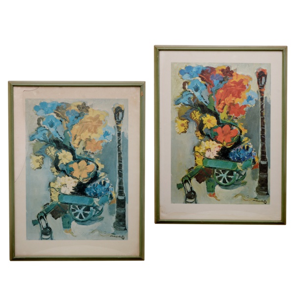 • Conjunto de 2 reproduções  Flores. Mané-Cate. 68 x 48 cm (MI). 73 x 53 cm (ME). Com vidro quebrado.