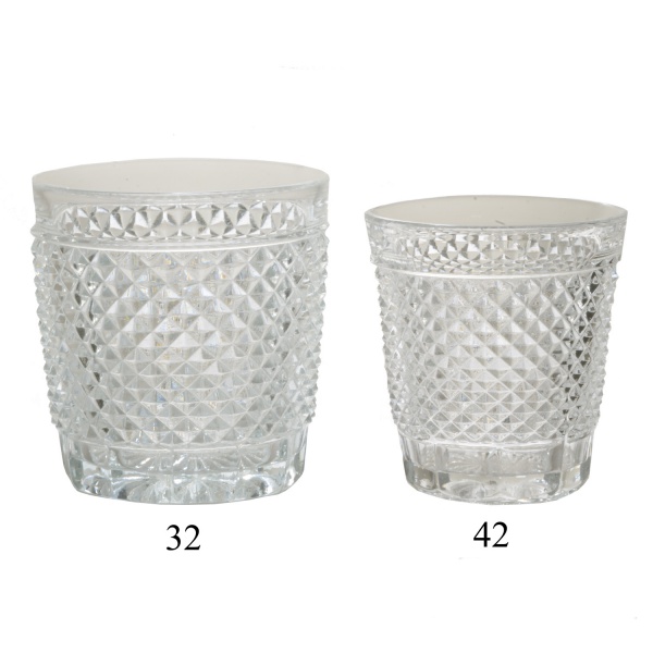 • Conjunto de copos em vidro translucido e apresentando decoração conhecida como bico de jaca.  32 (7 x 7 cm)  e 42 menores (7 x 6 cm).