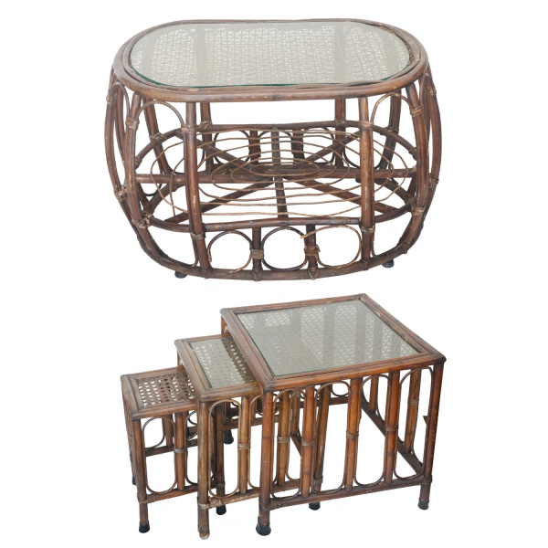 • Conjunto de mesas com estruturas em bambu, com plateaux em palhinha trançada sob tampos em vidro. Constando de 3 mesinhas nicho, com pernas retas realçadas por montantes verticais.(54 x 50 x 50 cm  / 47 x 38 x 38 cm / 40 x 25 x 25 cm).Acompanha mesa de centro de formato oval, apoiada em laterais arqueadas e ornadas por hastes recurvas e adornos circulares na base. (50 x 76 x 50 cm). Marcas de uso e do tempo.